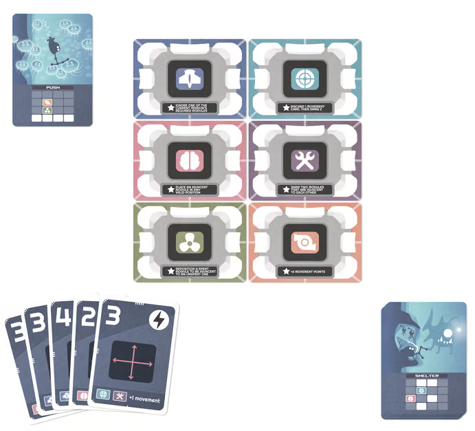 Aqua ROVE is a standalone entry in the ROVE series. In this solo spatial puzzler, the player must complete missions by using their movement cards to align ROVE’s modules in the proper pattern. Each module has a unique one-time ability that can give ROVE a much-needed boost at a key moment. As ROVE travels further, efficient use of movement points and module abilities becomes paramount to achieve success.