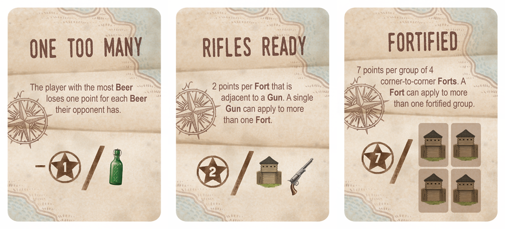 Blaze a trail by draftin' cards 'round the circle and placin' 'em in yer town, tryin' to connect matchin' territories to score prosperity points! But don't forget about them three bonus cards in the center of the circle that can score ya even more points — that is, if ya play yer cards right. With darn near five thousand unique ways to score and millions of draftin' and placin' combos, you'll never build the same town twice!